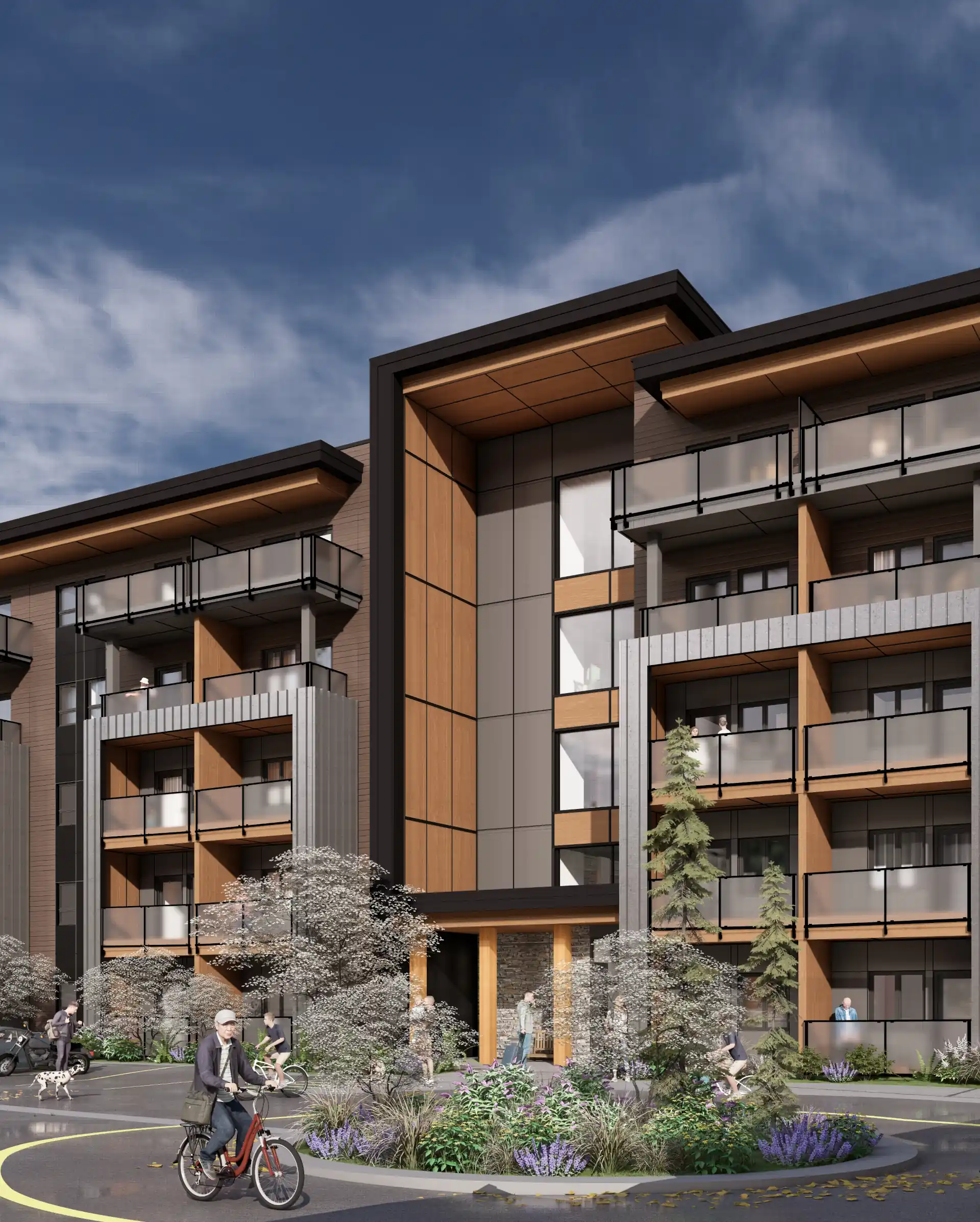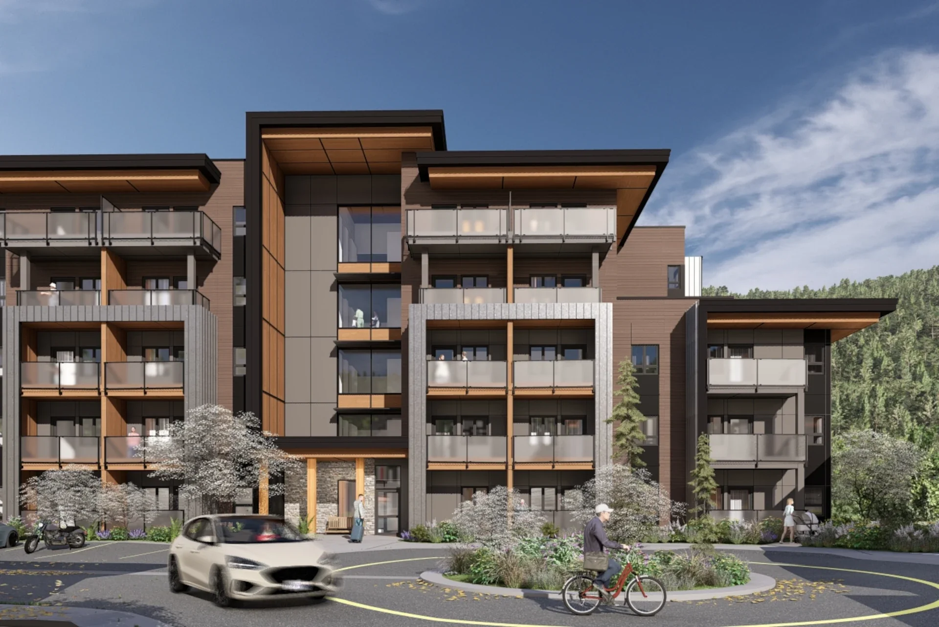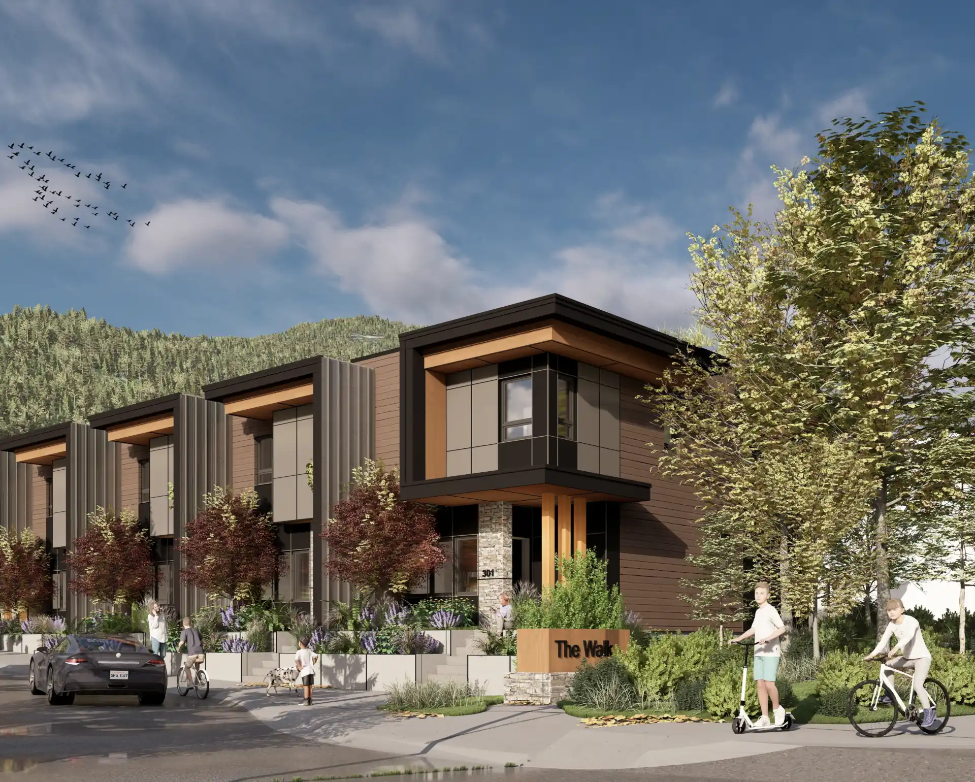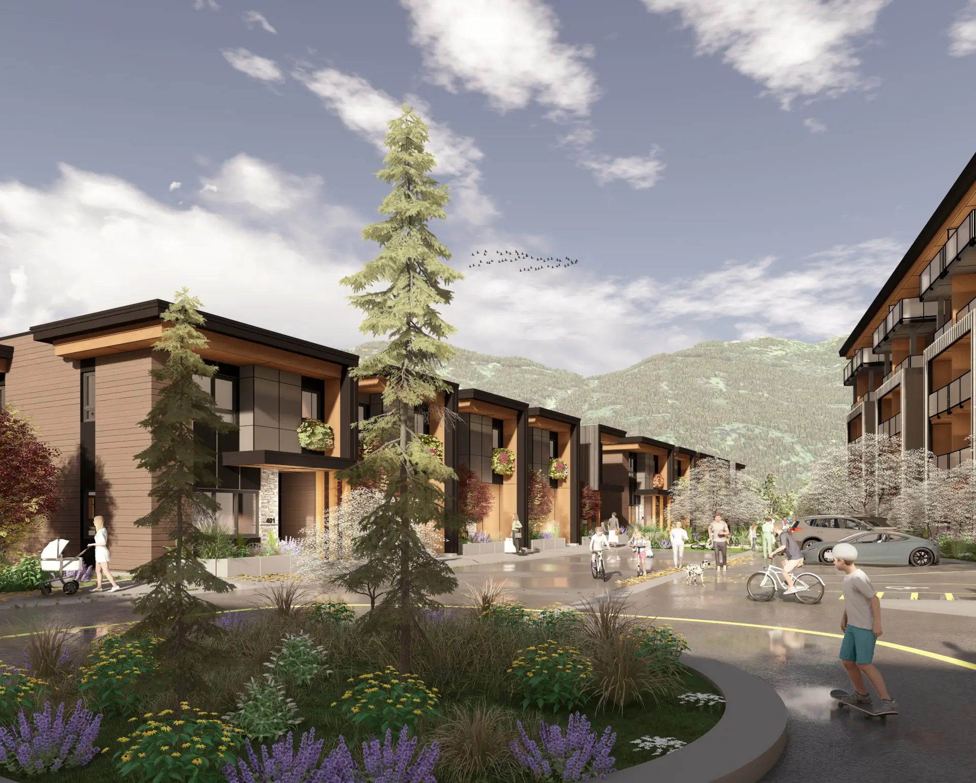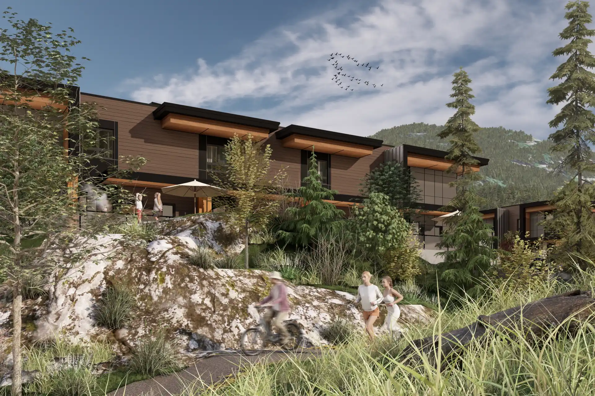 A larger residential project carefully placed among single-family and multifamily homes, with pedestrian links to Whistler’s hiking and biking trails.
