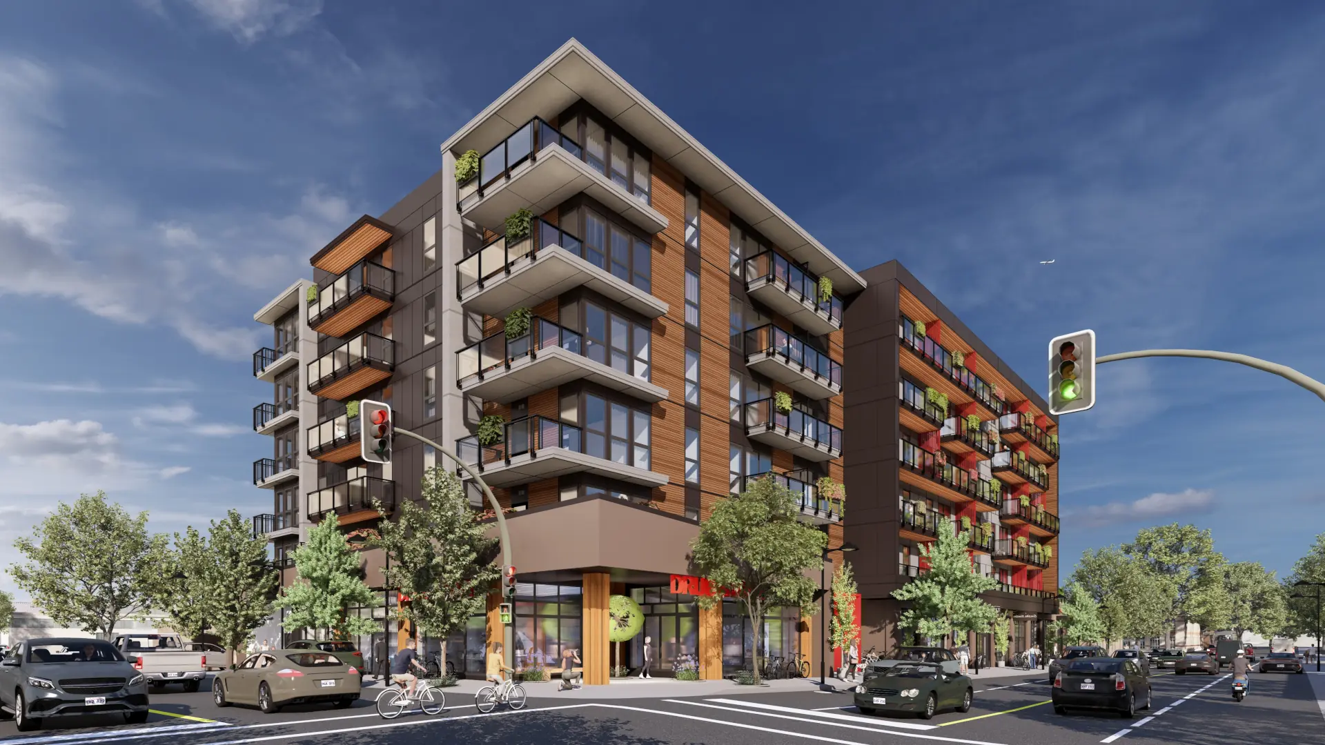 A downtown mixed-use building that engages pedestrians and fosters renewal in a challenged area. It marks the corner and offers visual interest across a large façade.